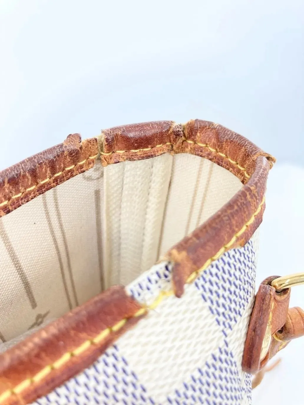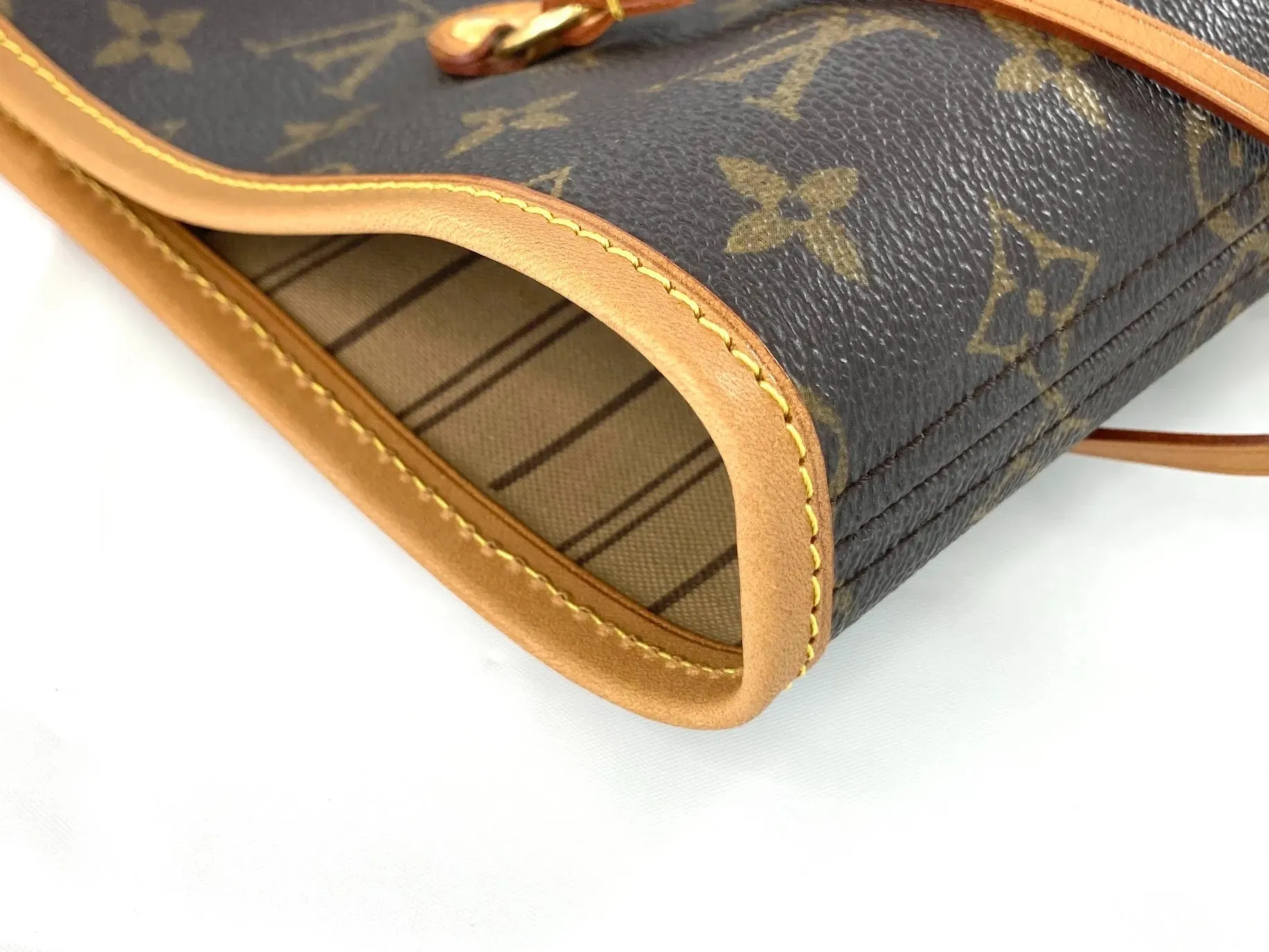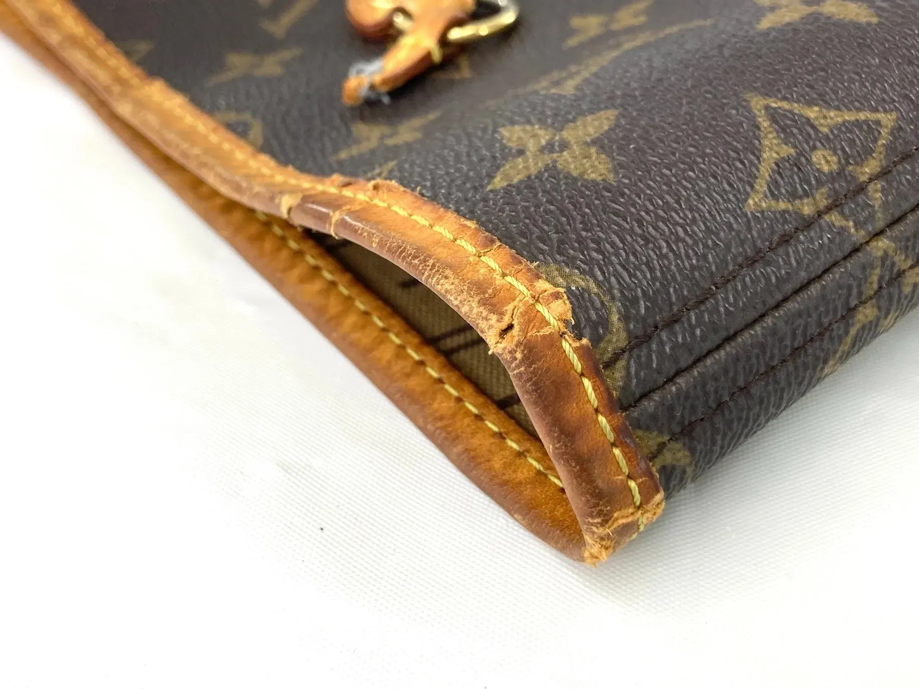 ルイ・ヴィトンの鞄では、モノグラムやダミエキャンバスとヌメ革・着色革の境界部分がバインダーとして処理されていることが多く見られます。