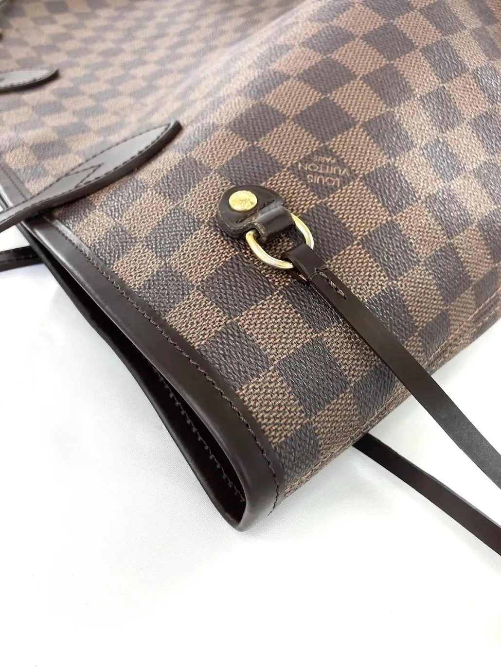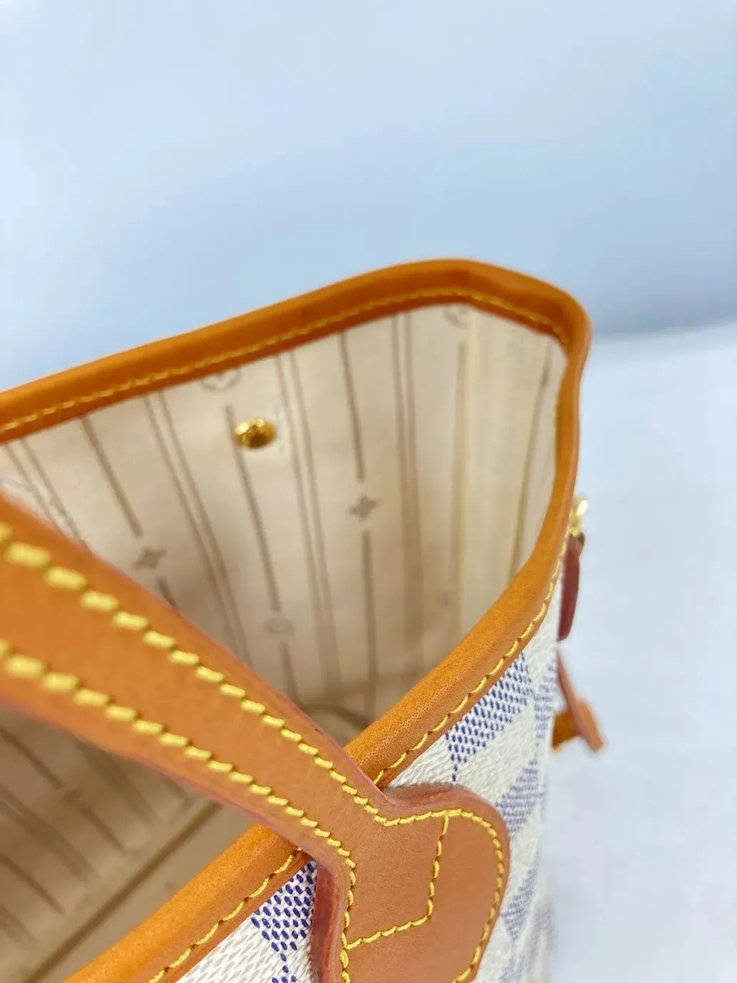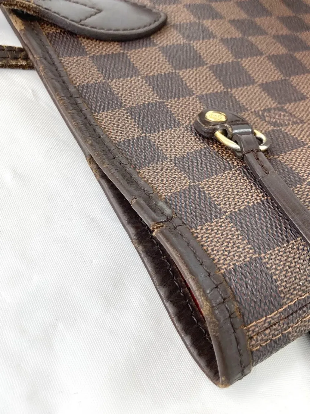 ルイ・ヴィトンの鞄では、モノグラムやダミエキャンバスとヌメ革・着色革の境界部分がバインダーとして処理されていることが多く見られます。